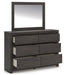 Details PCB3370B8: Includes headboard panel, headboard posts, footboard and rails, Made with engineered wood (MDF/particleboard/plywood) and decorative laminate for the right balance of affordability and durability , Dark charcoal finish over replicated oak grain, Decorative laminate replicates natural or man-made material surfaces with consistent color, pattern and texture, Foundation/box spring required, sold separately, Mattress available, sold separately, Assembly required, PCB3370B1: Includes dresser and mirror, Made with engineered wood (MDF/particleboard/plywood) and decorative laminate for the right balance of affordability and durability , Dark charcoal finish over replicated oak grain, Decorative laminate replicates natural or man-made material surfaces with consistent color, pattern and texture, Recessed hand grabs create hardware-less effect, 6 smooth-gliding drawers, Drawer interiors are lined with a faux linen laminate for a clean, finished look , Safety is a top priority, clothing storage units are designed to meet the most current standard for stability, ASTM F 2057 (ASTM International), Drawers extend out to accommodate maximum access to drawer interior while maintaining safety, Mirror attaches to back of dresser; can also be mounted on wall horizontally or vertically, Assembly required,