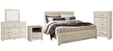 | Details | B331B2: Includes headboard, footboard and rails, Made of engineered wood (MDF/particleboard) and decorative laminate, Wispy white finish over replicated oak grain with authentic touch, Foundation/box spring required, sold separately, Mattress available, sold separately, Assembly required, Bed is compatible with an adjustable base, B331B1: Includes dresser and mirror, Made of engineered wood (MDF/particleboard) and decorative laminate, Wispy white finish over replicated oak grain with authentic touch, Brushed nickel-tone hardware with black edging, 7 smooth-gliding drawers (lined with faux linen laminate), Mirror attaches to back of dresser, Safety is a top priority, clothing storage units are designed to meet the most current standard for stability, ASTM F 2057 (ASTM International), Drawers extend out to accommodate maximum access to drawer interior while maintaining safety, Assembly required, B331-46: Made of engineered wood (MDF/particleboard) and decorative laminate, Wispy white finish over replicated oak grain with authentic touch, Brushed nickel-tone hardware with black edging, 5 smooth-gliding drawers (lined with faux linen laminate), Safety is a top priority, clothing storage units are designed to meet the most current standard for stability, ASTM F 2057 (ASTM International), Drawers extend out to accommodate maximum access to drawer interior while maintaining safety, Assembly required, B331-91: Made of engineered wood (MDF/particleboard) and decorative laminate, Wispy white finish over replicated oak grain with authentic touch, 1 storage cubby, 1 smooth-gliding drawer (lined with faux linen laminate), Brushed nickel-tone hardware with black edging, Slim-profile USB charging station, Power cord included; UL Listed, Assembly required, | |