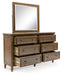 | Details | B787B2: Includes upholstered headboard, panel rails and bench footboard with slats, Made with hardwood solids, veneers and MDF substrates, Brown finish, Polyester upholstery, Nailhead trim, Turned feet, Foundation/box spring required, sold separately , Mattress available, sold separately, Assembly required, B787B1: Includes dresser and mirror, Made with hardwood solids, veneers and MDF substrates, Brown finish, Oil-rubbed bronze-tone knobs, 6 drawers with fully finished interior, dovetail construction and heavy duty ball-bearing side glides (top drawers felt lined), Turned feet, Mirror attaches to back of dresser, | |