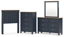 | Details | B414-53: Made with hardwood solids, mindi wood veneer and MDF substrates, Two-tone finish features a dark slate blue with a light brown wood-tone top, ¼" bolts (not included) are needed to attach headboard to your existing bed frame, Assembly required, B414B1: Includes dresser and mirror, Made with hardwood solids, mindi wood veneer and MDF substrates, Two-tone finish features a dark slate blue with light brown wood-tone top, Nickel-tone metal knobs, 6 drawers with fully finished interior, dovetail construction and heavy duty ball-bearing side glides, Mirror attaches to back of dresser, B414-45: Made with hardwood solids, mindi wood veneer and MDF substrates, Two-tone finish features a dark slate blue with a light brown wood-tone top, Nickel-tone metal knobs, 4 drawers with fully finished interior, dovetail construction and heavy duty ball-bearing side glides, | |