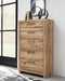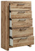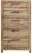 Inspired by natural beauty, refined to perfection. This chest of drawers brings cozy outdoor vibes to your bedroom with its warm and inviting golden rustic finish. Handles in an antiqued gunmetal hue adorn the five drawers on its framed front, adding an industrial touch to the simple, streamlined design.
