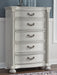 | Details | Made with hardwood solids, veneer and MDF substrate with cast resin components, Antiqued white finish, Metal pulls with polished pewter-tone finish, 5 smooth-gliding drawers with fully finished interiors, Drawers with French/English dovetail construction and heavy-duty ball-bearing side glides (top drawer felt lined), Thick decorative moulding, Reeded bun feet | |
