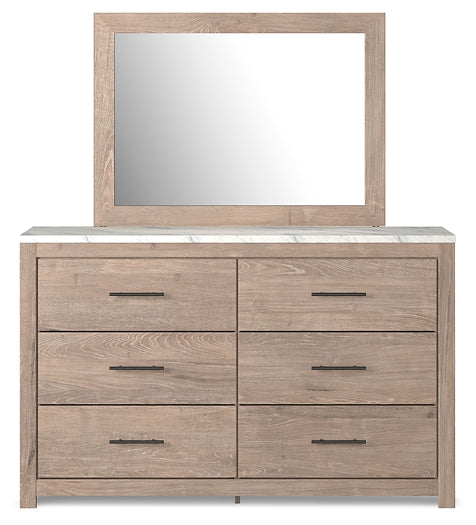 Signature Design by Ashley®Cool, clean and casually modern. This dresser and mirror's light natural finish and faux Calcutta marble top set the tone for your calming sanctuar...