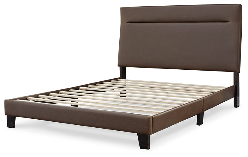 | Details | Includes queen-size upholstered headboard, footboard, rails and slats, Brown faux leather upholstery, Exposed wood feet, Bed does not require a foundation/box spring, Mattress available, sold separately, This headboard offers three height adjustments to accommodate various mattress thicknesses. Range is 48.75” up to 53.5”, Assembly required, Bed is compatible with an adjustable base | |