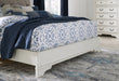 | Details | Includes upholstered panel headboard and panel footboard with rails , Made with hardwood solids, select wood veneer and MDF substrate, Laminated solid hardwood slat support rails (or LVL) with glued and screwed blocking for added strength, Chipped white finish, Foam headboard cushion with polyester upholstery, Foundation/box spring required, sold separately , Mattress available, sold separately, Assembly required | |