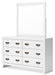 Details B427B9: Includes California king panel headboard, footboard, rails and slats, Made with hardwood solids, okoume veneer and MDF substrates, White finish, Foundation/box spring required, sold separately, Mattress available, sold separately, Assembly required, B427B1: Includes dresser and mirror, Made with hardwood solids, okoume veneer and MDF substrates, White finish, 6 drawers with dovetail construction and metal center guides, Hardware with dark finish, Drawer interiors are lined with a wood grain laminate for a clean, finished look, Mirror attaches to back of dresser,