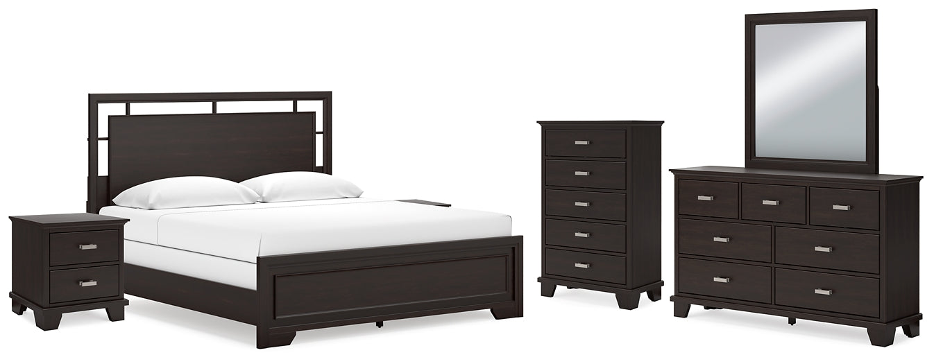 Covetown California King Panel Bed with Mirrored Dresser, Chest and 2 Nightstands