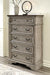 Details B751B5: Includes California king headboard, footboard and rails, Made with acacia wood, birch and acacia veneers, engineered wood and cast resin components, Antiqued gray finish, Ornately shaped headboard with inset upholstered cushion, Foundation/box spring required, sold separately, Mattress not included, sold separately, Assembly required, B751B1: Includes dresser and mirror, Made with acacia wood, birch and acacia veneers, engineered wood and cast resin components, Two-tone finish; antiqued gray body with a rich, deep walnut brown finish on top, Dark bronze-tone bails and knobs, 7 smooth-gliding drawers with dovetail construction, Framed drawer fronts , Overlay decorative corbels, Mirror attaches to back of dresser, Assembly required, B751-46: Made with acacia wood, birch and acacia veneers, engineered wood and cast resin components, Two-tone finish; antiqued gray body with a rich, deep walnut brown finish on top, Dark bronze-tone bails and knobs, 5 smooth-gliding drawers with dovetail construction, Framed drawer fronts, Overlay decorative corbels, B751-93: Made with acacia wood, birch and acacia veneers, engineered wood and cast resin components, Two-tone finish; antiqued gray body with a rich, deep walnut brown finish on top, Dark bronze-tone bails and knobs, 3 smooth-gliding drawers with dovetail construction, Framed drawer fronts, Overlay decorative corbels, 110V power supply with dual USB charging port, Power cord included; UL listed,
