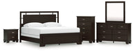 Details B441B9: Includes panel headboard, footboard, rails and slats, Made with hardwood solids, engineered wood veneer and MDF substrates, Dark brown finish, Floating panel headboard, Picture frame footboard, Foundation/box spring required, sold separately , Mattress available, sold separately, Assembly required, B441B1: Includes dresser and mirror, Made with hardwood solids, engineered wood veneer and MDF substrates, Dark brown finish, Metal bar pulls with bright nickel-tone finish, 7 smooth-gliding drawers with dovetail construction and metal center guides, Drawer interiors are lined with a wood grain laminate for a clean, finished look, Top moulding on dresser, Mirror attaches to back of dresser, B441-46: Made with hardwood solids, engineered wood veneer and MDF substrates, Dark brown finish, Metal bar pulls with bright nickel-tone finish, 5 smooth-gliding drawers with dovetail construction and metal center guides, Drawer interiors are lined with a wood grain laminate for a clean, finished look, Top moulding, B441-92: Made with hardwood solids, engineered wood veneer and MDF substrates, Dark brown finish, Metal bar pulls with bright nickel-tone finish, 2 smooth-gliding drawers with dovetail construction and metal center guides, Drawer interiors are lined with a wood grain laminate for a clean, finished look, Top moulding,