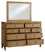 | Details | B895B7: Includes upholstered panel headboard, footboard, rails and slats, Made with hardwood solids, hickory veneer and MDF substrates, Light brown wood-tone finish, Polyester upholstery, Foundation/box spring required, sold separately, Mattress available, sold separately, Assembly required, B895B1: Includes dresser and mirror, Made with hardwood solids, hickory wood veneer and MDF substrates, Light brown wood-tone finish, Dark bronze-tone drawer pulls, 9 drawers with fully finished interior, dovetail construction and heavy duty ball-bearing side glides (top drawers felt lined), Mirror attaches to back of dresser, | |