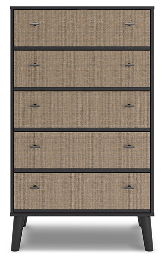 Put a retro spin on current trends with this chest of drawers. Its mixed-material look of matte black and replicated beige cane brings a casually cool feel to your bedroom. Simple, sleek hardware and splay legs round out the urban meets mid-century vibe.