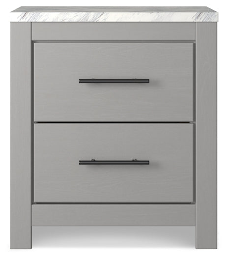 Cool, clean and casually modern. This nightstand’s wispy dove gray finish and faux Calcutta marble top set the tone for your calming sanctuary. Large linear pulls add dimension and authenticity. Two smooth-gliding drawers neatly accommodate your bedside needs.