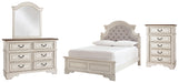 | Details | B743-45: Made of veneers, wood and engineered wood, with cast resin components, Antiqued two-tone finish, 5 smooth-gliding drawers with dovetail construction (top drawer felt lined), Dark bronze-tone hardware, B743B12: Made of veneers, wood and engineered wood, with cast resin components, Antiqued two-tone finish, 6 smooth-gliding drawers with dovetail construction, Dark bronze-tone hardware, Mirror attaches to back of dresser, Assembly required, Includes tipover restraint device, B743B14: Made of veneers, wood and engineered wood, with cast resin components, Includes upholstered headboard, footboard and rails, Distressed, chipped white finish, Upholstered headboard with foam cushion, button tufting, Assembly required, Mattress and foundation/box spring available, sold separately, Bed is compatible with an adjustable base, | |