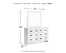 | Details | B427B4: Includes full panel headboard, footboard, rails and slats, Made with hardwood solids, okoume veneer and MDF substrates, White finish, Foundation/box spring required, sold separately, Mattress available, sold separately, Assembly required, B427B1: Includes dresser and mirror, Made with hardwood solids, okoume veneer and MDF substrates, White finish, 6 drawers with dovetail construction and metal center guides, Hardware with dark finish, Drawer interiors are lined with a wood grain laminate for a clean, finished look, Mirror attaches to back of dresser, B427-46: Made with hardwood solids, okoume veneer and MDF substrates, White finish, 5 drawers with dovetail construction and metal center guides, Hardware with dark finish, Drawer interiors are lined with a wood grain laminate for a clean, finished look, | |
