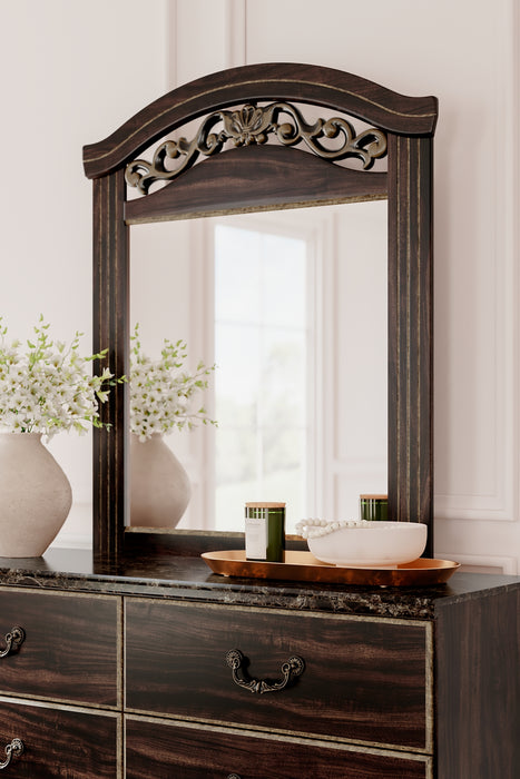 Timeless and classic, this dresser with mirror offers a grand design accented with rich hues and eye-catching details. Stately from every angle, its sophisticated elements blend together to display your love of traditional aesthetics. The mirror further elevates the look with ornate detailing at its crown.