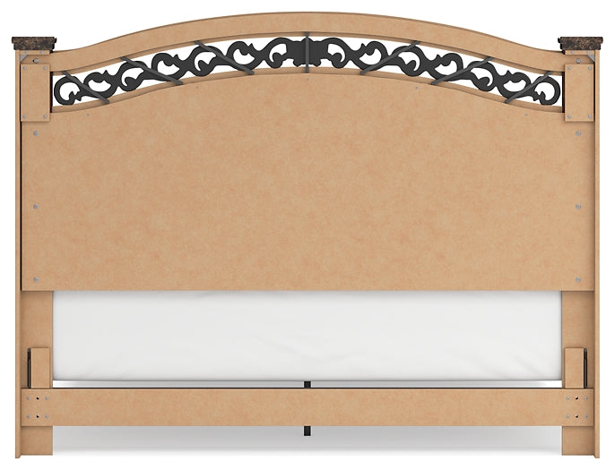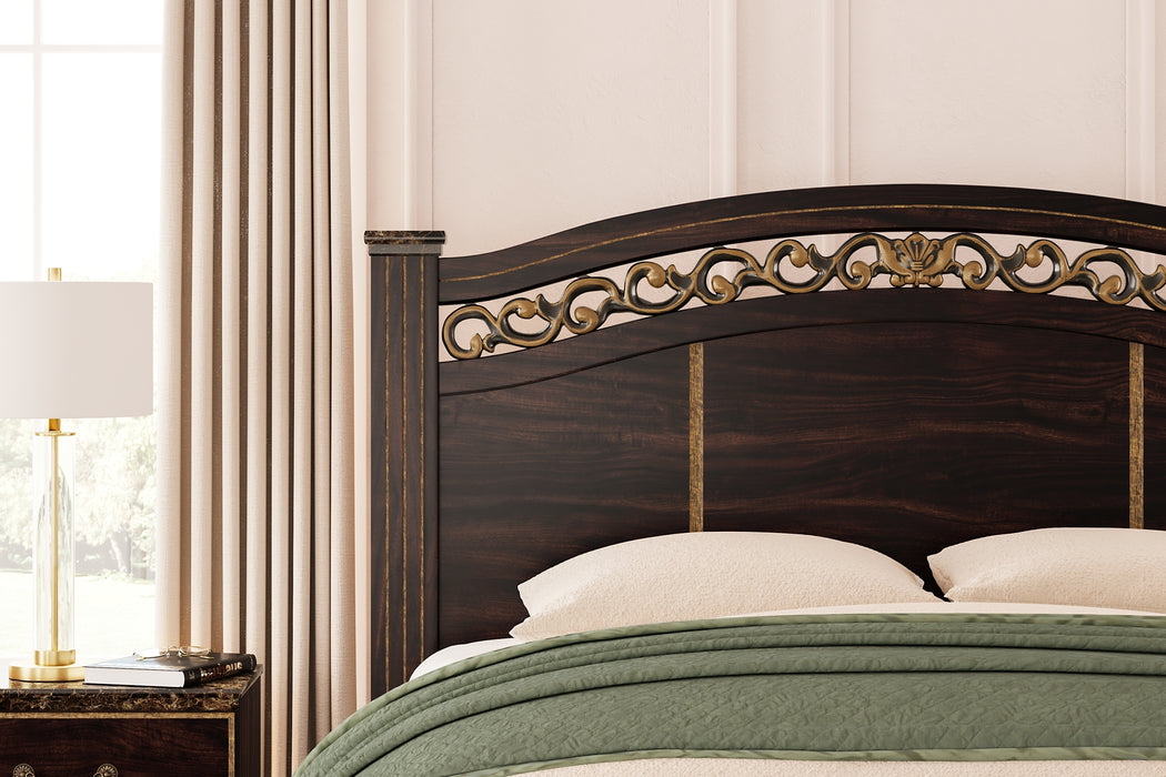 Timeless and classic, this queen poster bed offers a grand design accented with rich hues and eye-catching details. Stately from every angle, its sophisticated elements blend together to display your love of traditional aesthetics. The headboard further elevates the look with ornate detailing at its crown.