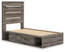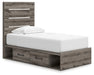 | Details | Includes panel headboard/footboard, rails with side storage and roll slats, Made with engineered wood (MDF/particleboard/plywood) and decorative laminate for the right balance of affordability and durability, Weathered gray finish over replicated oak grain, Decorative laminate replicates natural or man-made material surfaces with consistent color, pattern and texture, 2 smooth-gliding drawers, 2 storage cubbies, Bed does not require additional foundation/box spring; accommodates most zero clearance adjustable bases with the addition of a bunkie board, Mattress available, sold separately, Minor assembly required | |