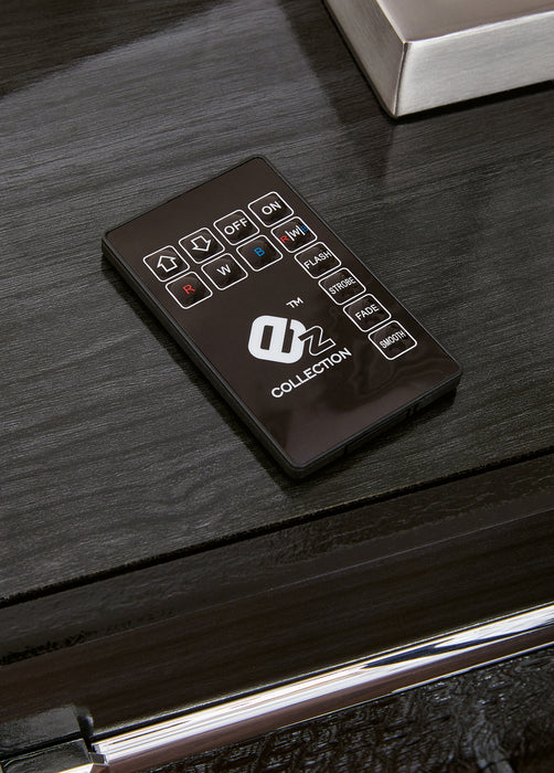 | Details | Includes upholstered panel headboard, footboard and rails, Made with engineered wood (MDF/particleboard) and decorative laminate, Replicated walnut wood grain, Textured black faux alligator finish, Chrome-tone faceted accents and handles, Faux crystal button tufting; glitter details, LED accent lighting with remote control for color and brightness options, Included remote holder keeps remote for lights discreet and accessible, 2 smooth-gliding drawers in footboard, Drawer interiors are lined with a faux linen laminate for a clean, finished look, Bed does not require a foundation/box spring, Mattress available, sold separately, Assembly required | |