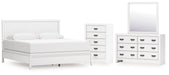 Details B427B8: Includes king panel headboard, footboard, rails and slats, Made with hardwood solids, okoume veneer and MDF substrates, White finish, Foundation/box spring required, sold separately, Mattress available, sold separately, Assembly required, B427B1: Includes dresser and mirror, Made with hardwood solids, okoume veneer and MDF substrates, White finish, 6 drawers with dovetail construction and metal center guides, Hardware with dark finish, Drawer interiors are lined with a wood grain laminate for a clean, finished look, Mirror attaches to back of dresser, B427-46: Made with hardwood solids, okoume veneer and MDF substrates, White finish, 5 drawers with dovetail construction and metal center guides, Hardware with dark finish, Drawer interiors are lined with a wood grain laminate for a clean, finished look,