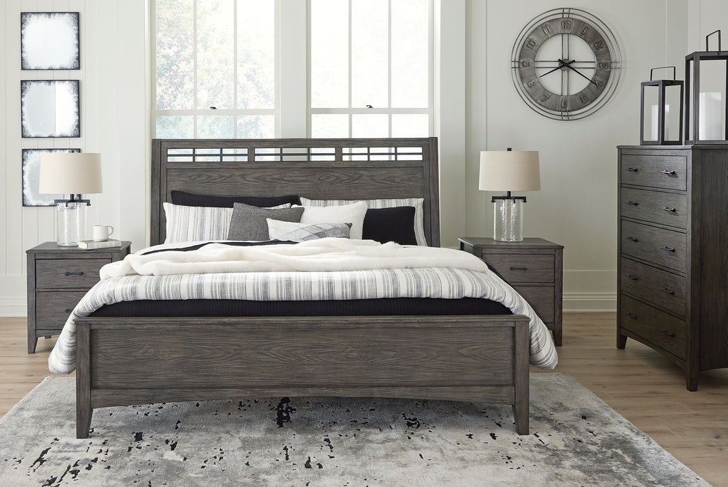 | Details | Includes king panel bed (headboard, rails and footboard with slats), 5-drawer chest, two 2-drawer nightstands and 6-drawer dresser with mirror, Made with hardwood solids and MDF substrates, Medium gray-brown finish with a blackened wood grain contrast; embossed wood grain texture, Bed with lay-back headboard; decorative inset metal grille with matte black finish, Dresser, chest and nightstand have smooth-gliding drawers with fully finished interiors and metal ball-bearing side glides (top drawers felt lined); inset drawers with metal bar pulls in matte black finish, Nightstand features 110V power supply with dual USB charging ports, Power cord included; UL Listed, Mirror attaches to back of dresser, Foundation/box spring required, sold separately, Mattress not included, sold separately, Assembly required | |