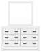 Details B427B8: Includes king panel headboard, footboard, rails and slats, Made with hardwood solids, okoume veneer and MDF substrates, White finish, Foundation/box spring required, sold separately, Mattress available, sold separately, Assembly required, B427B1: Includes dresser and mirror, Made with hardwood solids, okoume veneer and MDF substrates, White finish, 6 drawers with dovetail construction and metal center guides, Hardware with dark finish, Drawer interiors are lined with a wood grain laminate for a clean, finished look, Mirror attaches to back of dresser, B427-46: Made with hardwood solids, okoume veneer and MDF substrates, White finish, 5 drawers with dovetail construction and metal center guides, Hardware with dark finish, Drawer interiors are lined with a wood grain laminate for a clean, finished look, B427-92: Made with hardwood solids, okoume veneer and MDF substrates, White finish, 2 drawers with dovetail construction and metal center guides, Hardware with dark finish, Drawer interiors are lined with a clean wood grain laminate for a clean, finished look,