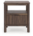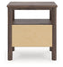 Details Made with engineered wood (MDF/particleboard/plywood) and decorative laminate for the right balance of affordability and durability, Rich brown finish over replicated walnut wood grain with authentic touch, Decorative laminate replicates natural or man-made material surfaces with consistent color, pattern and texture, Black drawer pull, 1 smooth-operating drawer, Drawer interior lined with a faux linen laminate for a clean, finished look, Open shelf, Ambient lighting under top, USB-A and USB-C charging ports, Power cord included; UL Listed, Minor assembly required