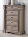 Details B916B2: Includes panel headboard, footboard with slats and rails, Made with hardwood solids, oak and ash veneer, cast resin components and engineered wood substrates, Tops with inlaid ash veneer border, Light warm grayish brown glazed wood finish, Breakfront pilasters, Inset picture frame panels, Headboard features light bridge with 2 overhead LED lights, Foundation/box spring required, sold separately , Mattress available, sold separately, Assembly required, B916B1: Includes dresser and mirror, Made with hardwood solids, oak and ash veneer, cast resin components and engineered wood substrates, Tops with inlaid ash veneer border, Light warm grayish brown glazed wood finish, Round metal knobs with satin nickel-tone finish, 10 drawers with fully finished interior, dovetail construction and ball-bearing side glides, Drawers with inset framed fronts, Dresser with breakfront pilasters, Mirror frame features light bridge with 2 mini LED lights, Mirror attaches to back of dresser, B916-46: Made with hardwood solids, oak and ash veneer, cast resin components and engineered wood substrates, Top with inlaid ash veneer border, Light warm grayish brown glazed wood finish, Round metal knobs with satin nickel-tone finish, 5 drawers with fully finished interior, dovetail construction and ball-bearing side glides, Drawers with inset framed fronts, Breakfront pilasters,