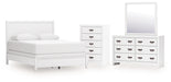 Details B427B6: Includes queen panel headboard, footboard, rails and slats, Made with hardwood solids, okoume veneer and MDF substrates, White finish, Foundation/box spring required, sold separately, Mattress available, sold separately, Assembly required, B427B1: Includes dresser and mirror, Made with hardwood solids, okoume veneer and MDF substrates, White finish, 6 drawers with dovetail construction and metal center guides, Hardware with dark finish, Drawer interiors are lined with a wood grain laminate for a clean, finished look, Mirror attaches to back of dresser, B427-46: Made with hardwood solids, okoume veneer and MDF substrates, White finish, 5 drawers with dovetail construction and metal center guides, Hardware with dark finish, Drawer interiors are lined with a wood grain laminate for a clean, finished look,