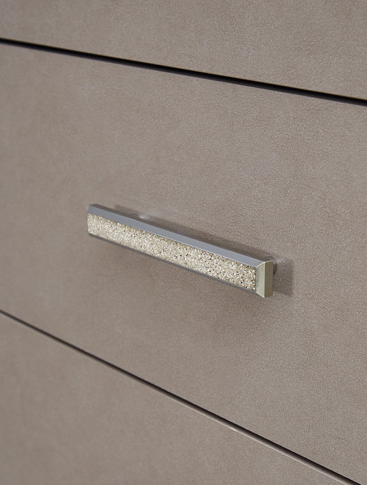 Love sleek and bold contemporary style? Drink in the beauty of this bedroom package. Its eye-catching details include glam glitter accents and the look of leather grain with a subtle gray finish. Combined with the streamlined aesthetic, this set is a simply stunning way to achieve the bedroom of your dreams.