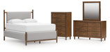 | Details | B615B2: Includes upholstered panel headboard and footboard , Solid wood frame, Due to the use of natural wood materials, some variations may occur , Frame with medium brown wood tone finish, Polyester upholstery, Tapered legs, Foundation/box spring required, sold separately , Mattress available, sold separately, Assembly required, B615B1: Includes dresser and mirror, Made with hardwood solids, mango wood veneer and MDF substrates, Medium brown wood-tone finish, 6 drawers with fully finished interior, dovetail construction and heavy duty ball-bearing side glides, Round tapered legs, Mirror attaches to back of dresser, B615-46: Made with hardwood solids, mango wood veneer and MDF substrates, Medium brown wood-tone finish, 5 drawers with fully finished interior, dovetail construction and heavy duty ball-bearing side glides, Round tapered legs, | |