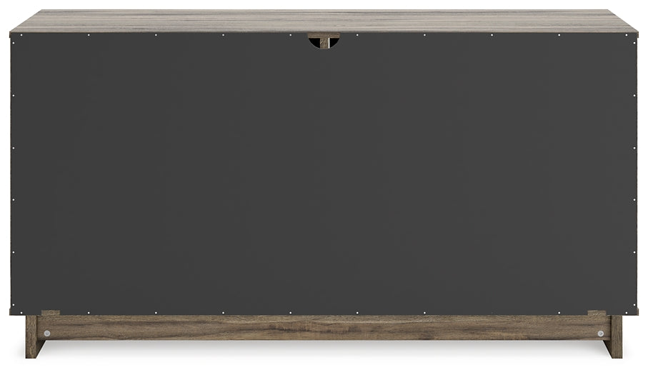 Your modern sanctuary is within reach. The subtle design of this dresser is accented with a low profile base. Its weathered brown finish is complemented with refined champagne-colored handles on the six smooth-gliding drawers.