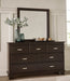 | Details | B441B2: Includes panel headboard, footboard, rails and slats, Made with hardwood solids, engineered wood veneer and MDF substrates, Dark brown finish, Floating panel headboard, Picture frame footboard, Foundation/box spring required, sold separately , Mattress available, sold separately, Assembly required, B441B1: Includes dresser and mirror, Made with hardwood solids, engineered wood veneer and MDF substrates, Dark brown finish, Metal bar pulls with bright nickel-tone finish, 7 smooth-gliding drawers with dovetail construction and metal center guides, Drawer interiors are lined with a wood grain laminate for a clean, finished look, Top moulding on dresser, Mirror attaches to back of dresser, | |