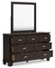 Details B441B2: Includes panel headboard, footboard, rails and slats, Made with hardwood solids, engineered wood veneer and MDF substrates, Dark brown finish, Floating panel headboard, Picture frame footboard, Foundation/box spring required, sold separately , Mattress available, sold separately, Assembly required, B441B1: Includes dresser and mirror, Made with hardwood solids, engineered wood veneer and MDF substrates, Dark brown finish, Metal bar pulls with bright nickel-tone finish, 7 smooth-gliding drawers with dovetail construction and metal center guides, Drawer interiors are lined with a wood grain laminate for a clean, finished look, Top moulding on dresser, Mirror attaches to back of dresser, B441-92: Made with hardwood solids, engineered wood veneer and MDF substrates, Dark brown finish, Metal bar pulls with bright nickel-tone finish, 2 smooth-gliding drawers with dovetail construction and metal center guides, Drawer interiors are lined with a wood grain laminate for a clean, finished look, Top moulding,