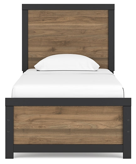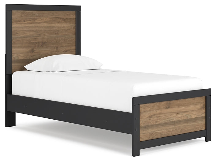 Relaxed yet striking, this queen panel bed brings casual beauty and function to your dream destination. The delightful two-tone treatment blends a fresh replicated walnut grain with a matte black finish that's easy to love. Its simplicity lends a contemporary touch that suits your bedroom's style to a T.
