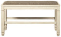 The beauty of this upholstered dining bench is something to savor. Serving up comfort and flair, this generously scaled counter-height bench entices with a cushioned seat covered in a heavy woven fabric that complements the antiqued white finish.