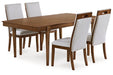 | Details | D615-45: Made with hardwood solids, mango wood veneer and MDF substrate, Medium brown wood-tone finish, Seats up to 8, Removable center leaf, Table extends by pulling both ends and dropping in leaf, Round tapered legs, Dining chairs sold separately, D615-05: Made with solid hardwood frame, Medium brown wood-tone finish, Polyester upholstery, Foam cushion, Chair back with cutout handle, Tapered legs, | |