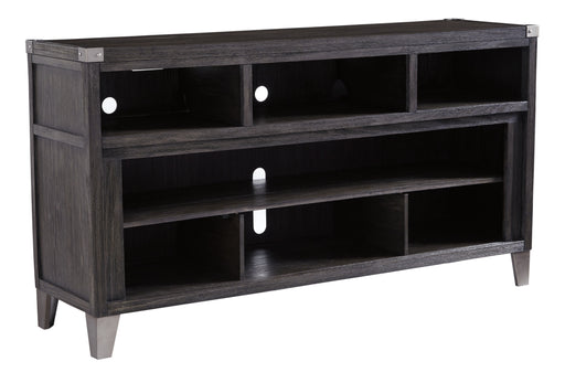 Signature Design by Ashley®Make watching TV a joy with this large TV stand. Its top surface accommodates TVs up to 70 inches. The stand's rustic-industrial style—with a gray ...