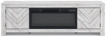 This TV stand with electric fireplace embraces a classically charming aesthetic and repurposes it for modern living. Its whitewash replicated paint appeals to your love of vintage character, while the chic chevron pattern is effortlessly on trend. Media accessories stay tucked away in style thanks to hidden storage behind the doors. And for added ambiance, the electric fireplace brings a cozy-cool vibe to your living room. With the touch of a button, activate the LED-lit flame and adjust the temperature or the flame brightness. The flame effect includes multiple color options and a realistic-looking faux birch log set.