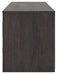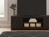 Details Made with engineered wood (MDF/particleboard/plywood) and decorative laminate for the right balance of affordability and durability, Dark charcoal finish over replicated oak grain, Decorative laminate replicates natural or man-made material surfaces with consistent color, pattern and texture, Integrated door pulls, 2 cabinets, each with an adjustable shelf, Open center shelf, Compatible with the W100-703 fireplace insert (sold separately), Assembly required
