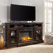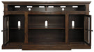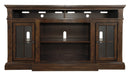 The beauty of this TV stand will immediately engage you. The slight breakfront shape is a rare find and an ideal fit among traditional and eclectic tastes. Soft black undertones highlight the warm finish. Multiple cubbies and glass-door enclosed shelves organize your audio/video components and plenty of extras. Sold separately, an electric fireplace fits neatly in the center cubby.