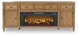 Taking a timeless approach to casual beauty, this TV stand with electric fireplace brings easygoing elegance to the everyday. With its light brown wood tone, it seamlessly slips into your room’s aesthetic. Two spacious cabinets (each with an adjustable shelf) and four drawers offer plenty of storage for media and electronics. Enhancing the experience, the fireplace insert brings a touch of warmth and beautiful ambiance to your living room. With the touch of a button, adjust the temperature and the flame brightness, and connect your device to the built-in wireless speakers. The flame effect includes a realistic-looking log set with glowing embers, along with an ambient down light.