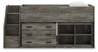 Details Includes loft bed, left storage steps with loft ends, roll slats, loft bookcase and loft drawer storage, Made with engineered wood (MDF/particleboard/plywood) and decorative laminate for the right balance of affordability and durability, Rustic warm gray finish over replicated oak grain with authentic touch, Decorative laminate replicates natural or man-made material surfaces with consistent color, pattern and texture, 4 storage cubbies, 3 smooth-gliding storage drawers, Bed does not require additional foundation/box spring, Mattress available, sold separately, Assembly required
