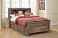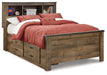 | Details | Includes bookcase headboard, footboard, under bed storage with side rail and slats, Made of engineered wood (MDF/particleboard) and decorative laminate, Warm rustic plank finish over replicated oak grain with authentic touch, 2 large storage drawers, Nailhead accents, Bed does not require additional foundation/box spring; accommodates most zero clearance adjustable bases with the addition of a bunkie board, Mattress available, sold separately, Assembly required | |