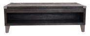 Mixed material lift top table truly elevates rustic-industrial style. Weather-washed pine wood and veneers are contrasted with canted metal legs and corner bracket accents for a uniquely chic merger of earthy beauty and contemporary flair. A handy spring-loaded mechanism brings the tabletop to you, while two drawers with removable storage trays are packed with possibilities.