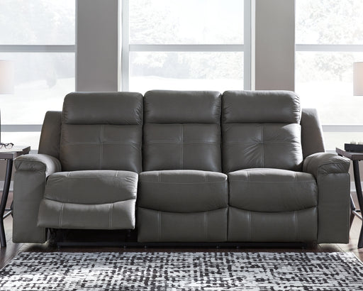Signature Design by Ashley®Rustic character comes forth in this dark gray reclining sofa. Designer stitching adds a fashion-forward touch to its soft cushions. Faux suede fab...