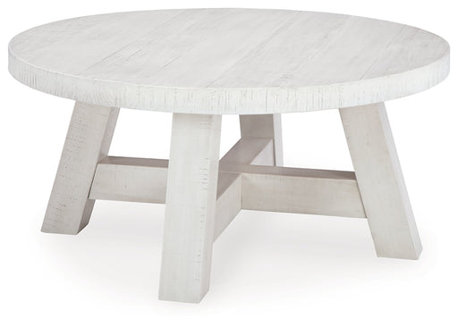 Signature Design by Ashley®Carefully crafted with farmhouse appeal, this coffee table features braced posts and a thick round tabletop. The off-white finish adds depth and ch...