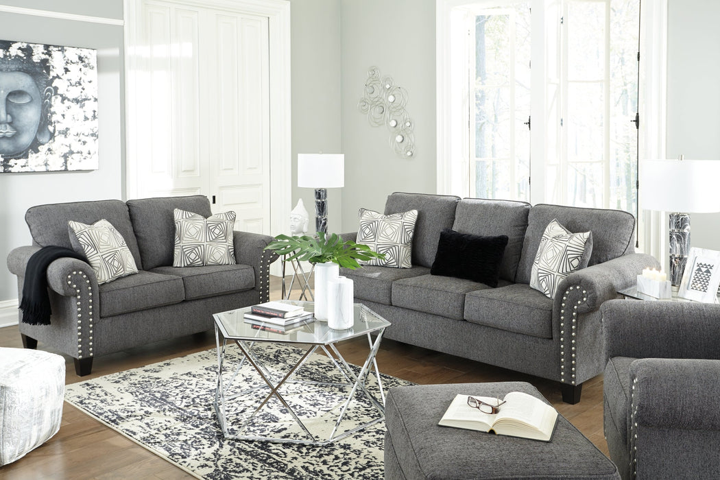 A contemporary dream. This loveseat checks off everything on your list. Its designer profile is accentuated with roll arms and pewter-tone nailhead trim. Upholstered in a textured chenille, the feel is up to par with the look. Geometric throw pillows and tapered accent legs finish off the loveseat's top-to-bottom style.