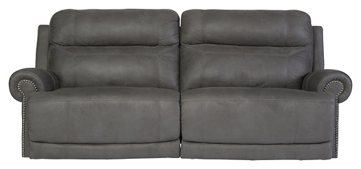 Sparing that "puffy" look you might expect from a recliner, this reclining sofa doesn't hold back when it comes to contemporary style. Subtle touches such as sporty jumbo stitching, nailhead trim and a "weather worn" effect on the upholstery give this handsome piece a buttoned-up appeal and fresh feel.