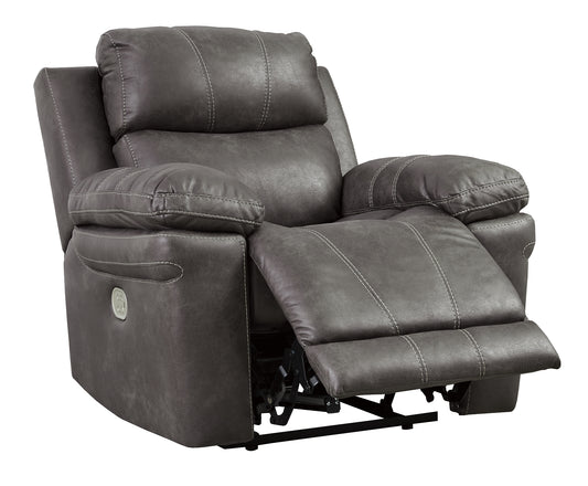 Details Dual-sided recliner; middle seat remains stationary, Corner-blocked frame with metal reinforced seat, Attached back and seat cushions, One-touch power control with adjustable positions, High-quality foam cushions wrapped in poly fiber, Easy View™ power adjustable headrest, Extended ottoman for enhanced comfort, Includes USB charging port in each power control, Faux leather upholstery, Power cord included; UL Listed