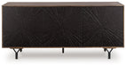 Details Made with solid mango wood sides, top and interior; doors made with engineered wood; back made with mango veneer and engineered wood substrate, Gray-brown and deep brown finish, “Y” shaped metal legs with black finish, 3 doors with carved starburst pattern and push magnet door function, 3 removable shelves, Openings in back for electronics, Assembly required
